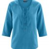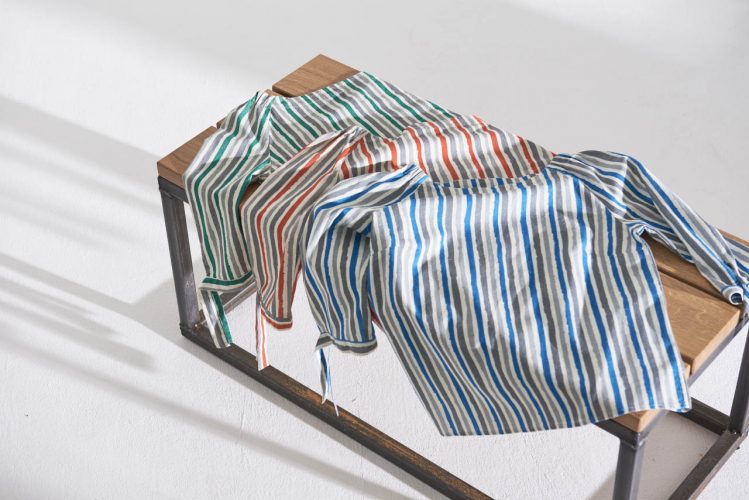 Bluza ravnega kroja, polovični rokavi, tkanina, 3-barven črtast dizajn, zaključki rokavov s trakovi za zavezovanje, širok vratni izrez z elastičnim delom na področju ramen.