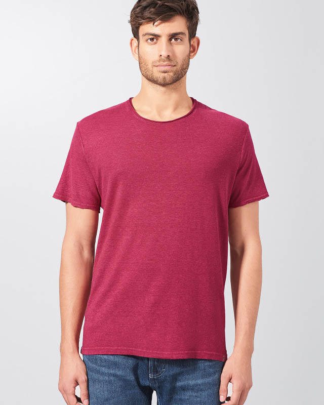 Preprosta majica s kratkimi rokavi, džersi, nezaključeni, zarolani robovi na izrezu in koncih rokavov.