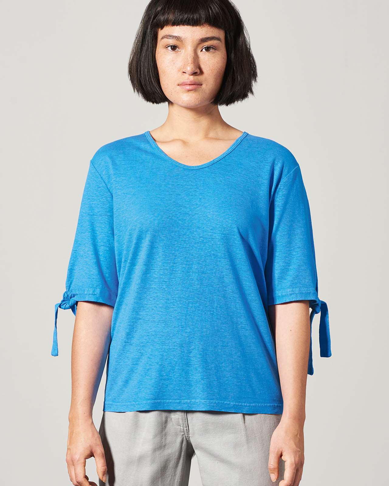 Ohlapno padajoč kroj te udobne majice s polovičnimi rokavi ti daje laskavo postavo. Je odličen osnovni kos z rahlo igrivim pridihom in primeren za vse spodnje dele – hlače ali krilo. Trakove na rokavih lahko ohlapno pustiš viseti ali narediš pentljo – kakorkoli se že počutiš v danem trenutko.
