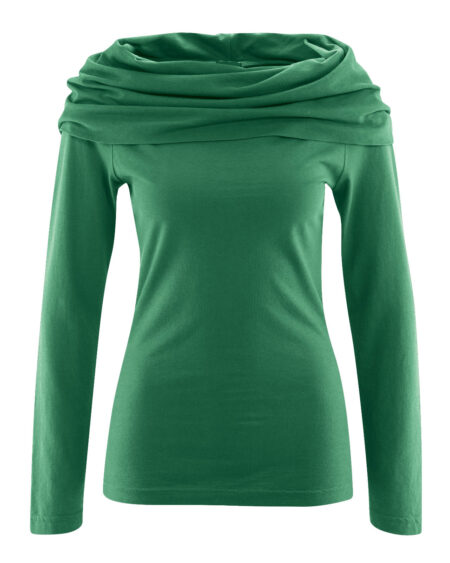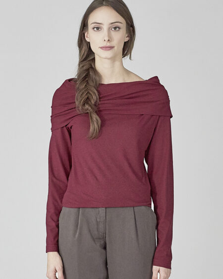 Majica z dolgimi rokavi in elegantnim ovratnikom je preprosto nekaj posebnega. Je oprijetega, a ne tesnega kroja in se čudovito prilagaja postavi. Velikodušen “carmen” izrez lahko nosiš na eni rami ali obeh. Edinstvena tkanina se ovije okoli rame in v trenutku ustvari eleganten videz.