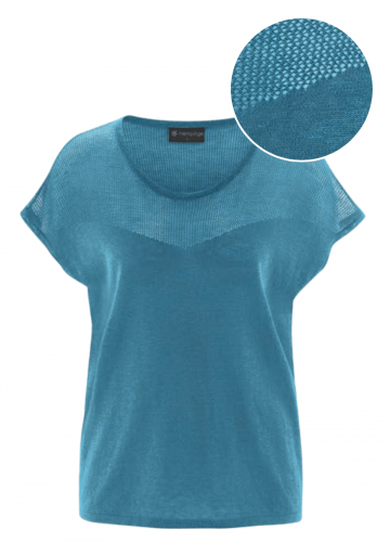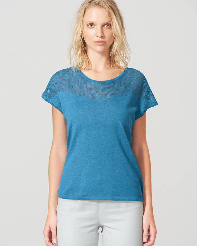 Ta majica z različno strukturo pletenja je idealna za šik izgled. V središče oči je postavljena privlačna mrežasta struktura. V kombinaciji s preprostimi kratkimi hlačami bo poletni stajling popoln.