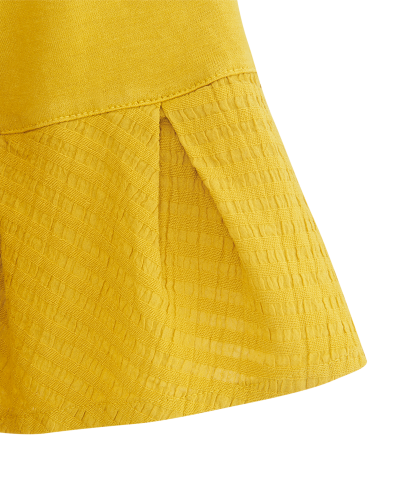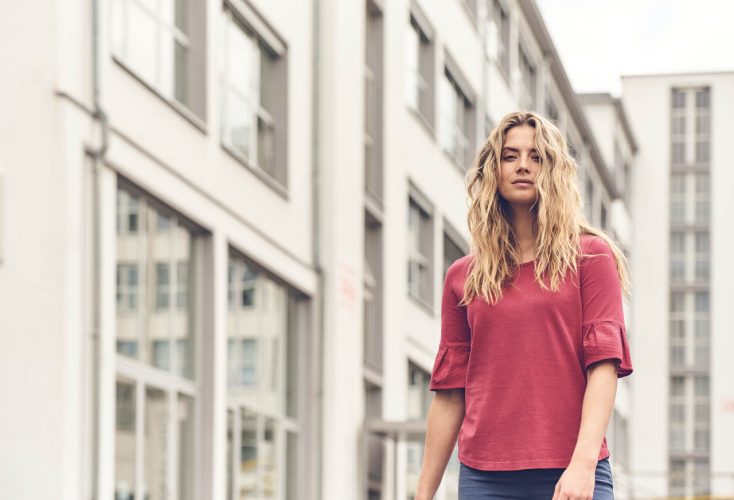 Zaradi z ljubeznijo izbranih poletnih barv je ta majica obvezna za sezono pomlad-poletje. Krasijo jo polovični rokavi, zato je primerna tudi za nekoliko hladnejše pomladanske dni. Strukturirani zvonasti rokavi v vzorcu vaflja so njena posebnost.