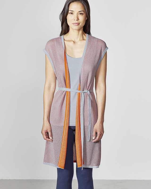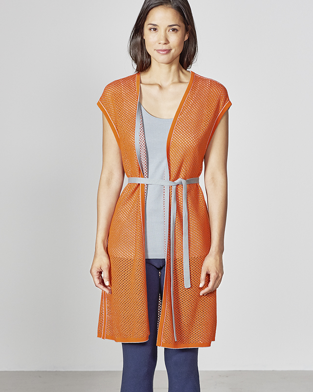 Mrežast telovnik, ki se lahko obrne na obe strani, barvno kontrastni šivi, pas iz tekstila.