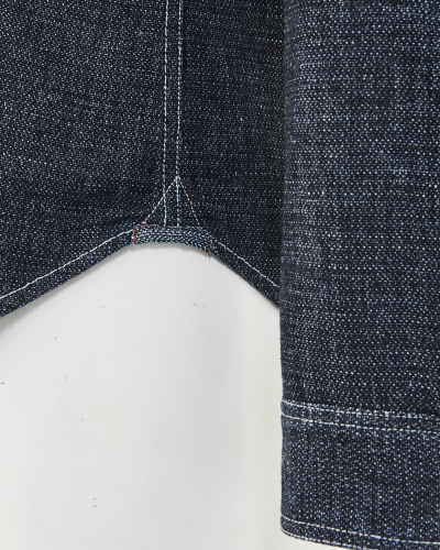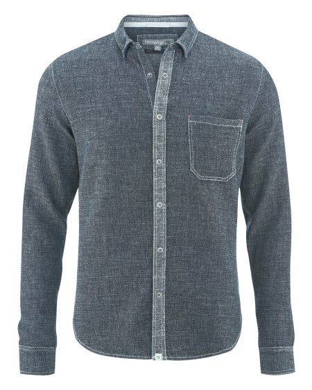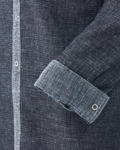 Srajca, tkanina, videz džinsa, barvno kontrastna letev s kovinskimi pritisnimi gumbi brez niklja, odprt prsni žep, dekorativen trak na notranji strani ovratnika, kontrastne, prilagodljive manšete z zavihkom, zaobljen spodnji rob.