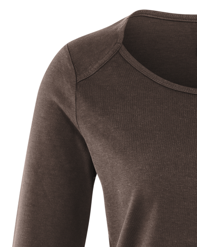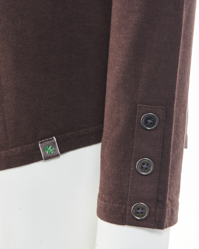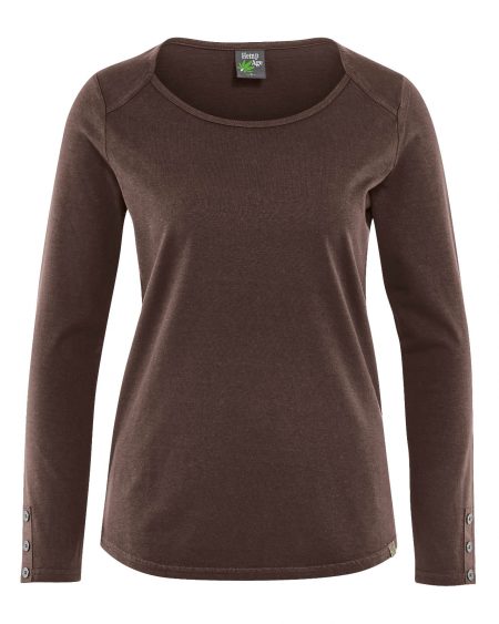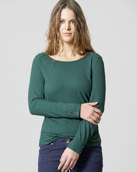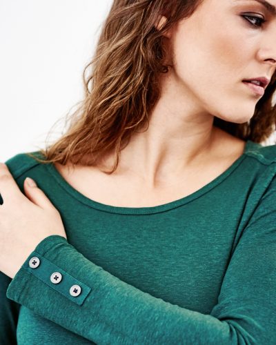 Umirjena majica z dolgimi rokavi, rahlo krtačen džersi, kovinski okrasni gumbi brez niklja na koncu rokavov, okrasen detajl na ramenih.
